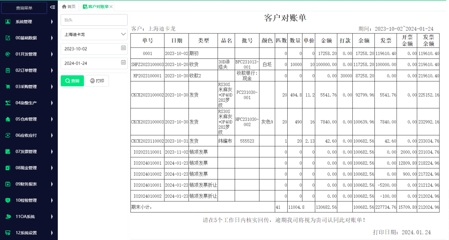 6、紡織貿(mào)易軟件的財務(wù)管理:包括各種坯布、色坯的應(yīng)收應(yīng)付對帳情況、各個生產(chǎn)環(huán)節(jié)的物流情況、每月客戶與供應(yīng)商的對帳單、所有公司和個人的帳戶進出情況、銷項與進項的增值稅發(fā)票及付款收款情況、各種費用報銷情況、每月的利潤情況等等。