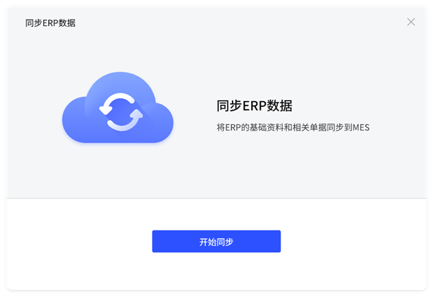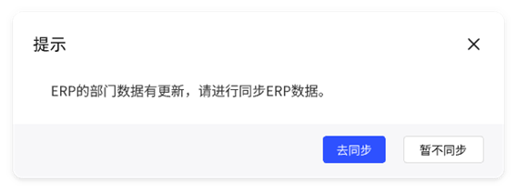 ERP批量操作后,在同步內容范圍內的基礎資料只要檢測到數據有差異(僅檢查加工單位、部門、職員、項目、車間),用戶登錄MES后進行彈窗提示數據有更新,引導用戶去做同步ERP數據操作。比如部門有差異提示如下:
