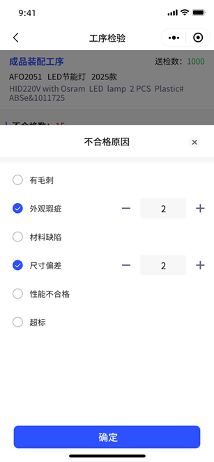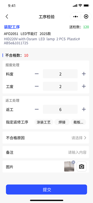 客戶在某些工序報工時,會進行檢驗,確定正品和廢品;根據不同的結果判斷是否計件以及統計檢驗數據等。