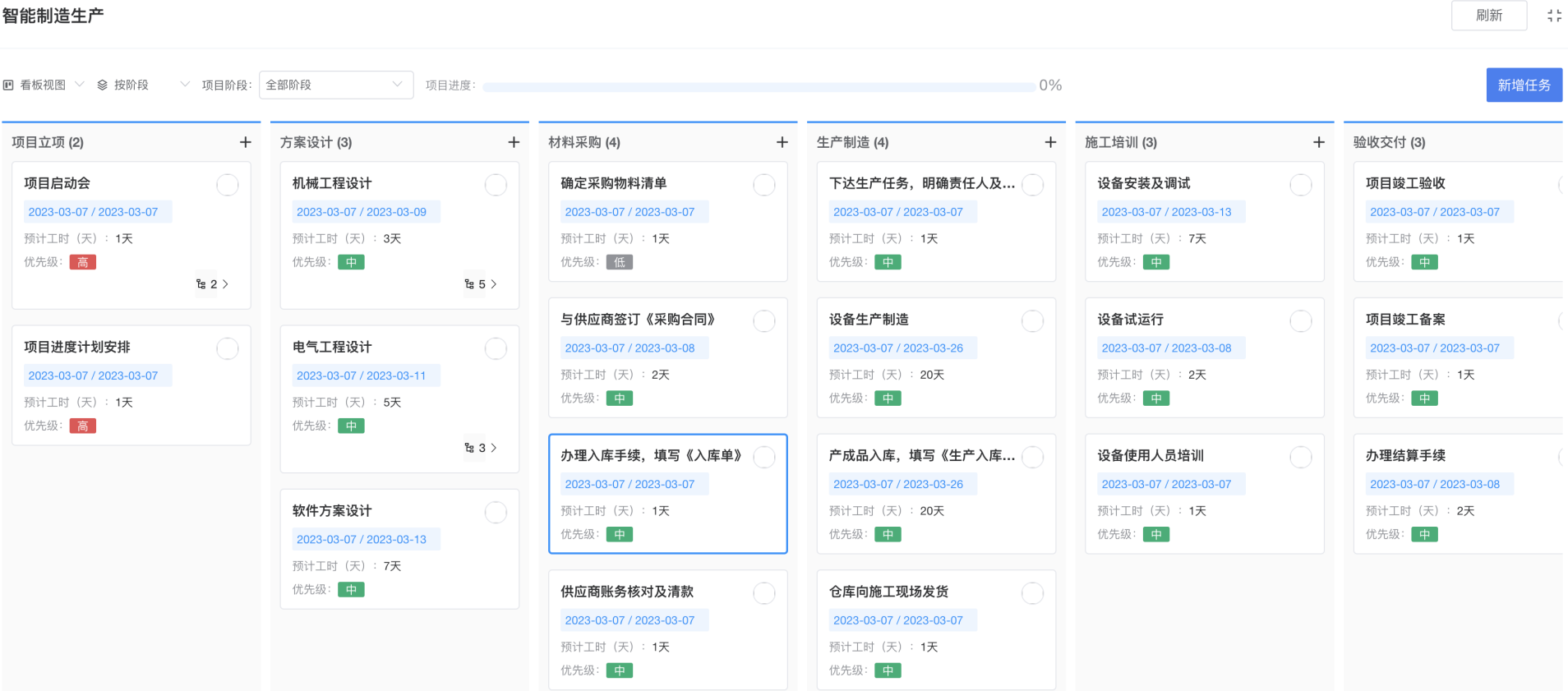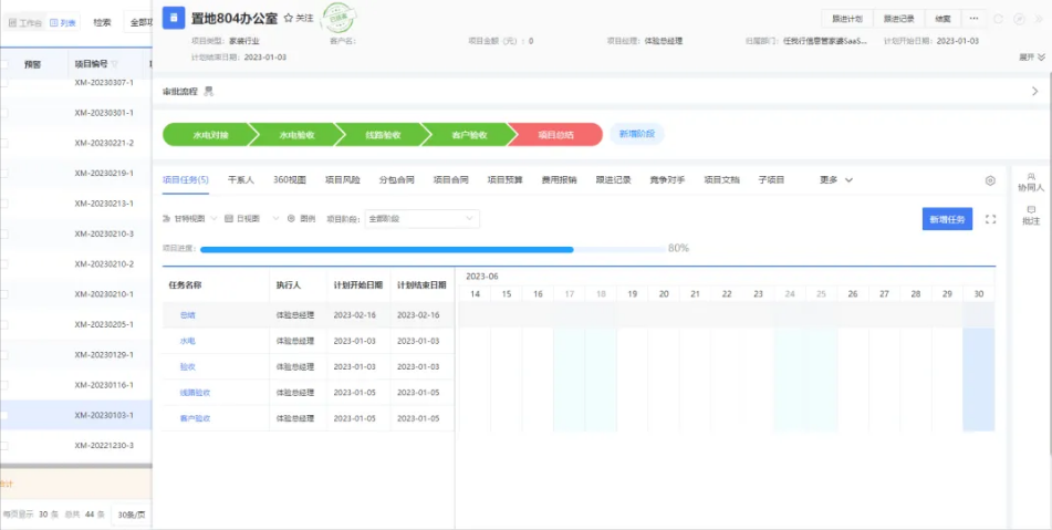 根據項目模板中設置的基礎階段、里程碑及任務。在實際項目運行中,根據計劃推進階段、里程碑及任務。由階段、里程碑及任務的執行狀態,生成甘特圖。