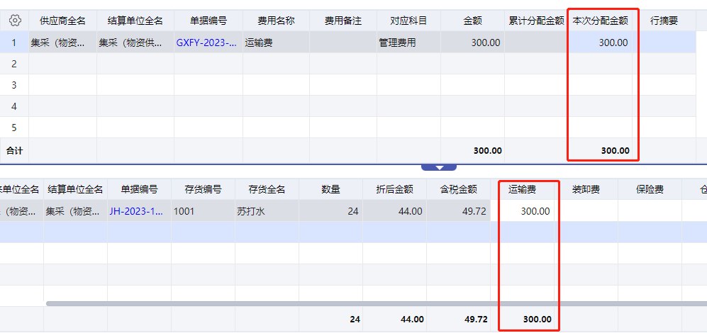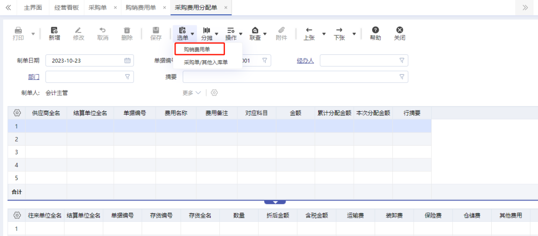 在業(yè)務(wù)處理—采購業(yè)務(wù)—采購費(fèi)用分配單中,上表體選擇待分配的購銷費(fèi)用單,下表體再選擇需要分配的采購單或其他入庫單,即可對(duì)采購費(fèi)用進(jìn)行分配。