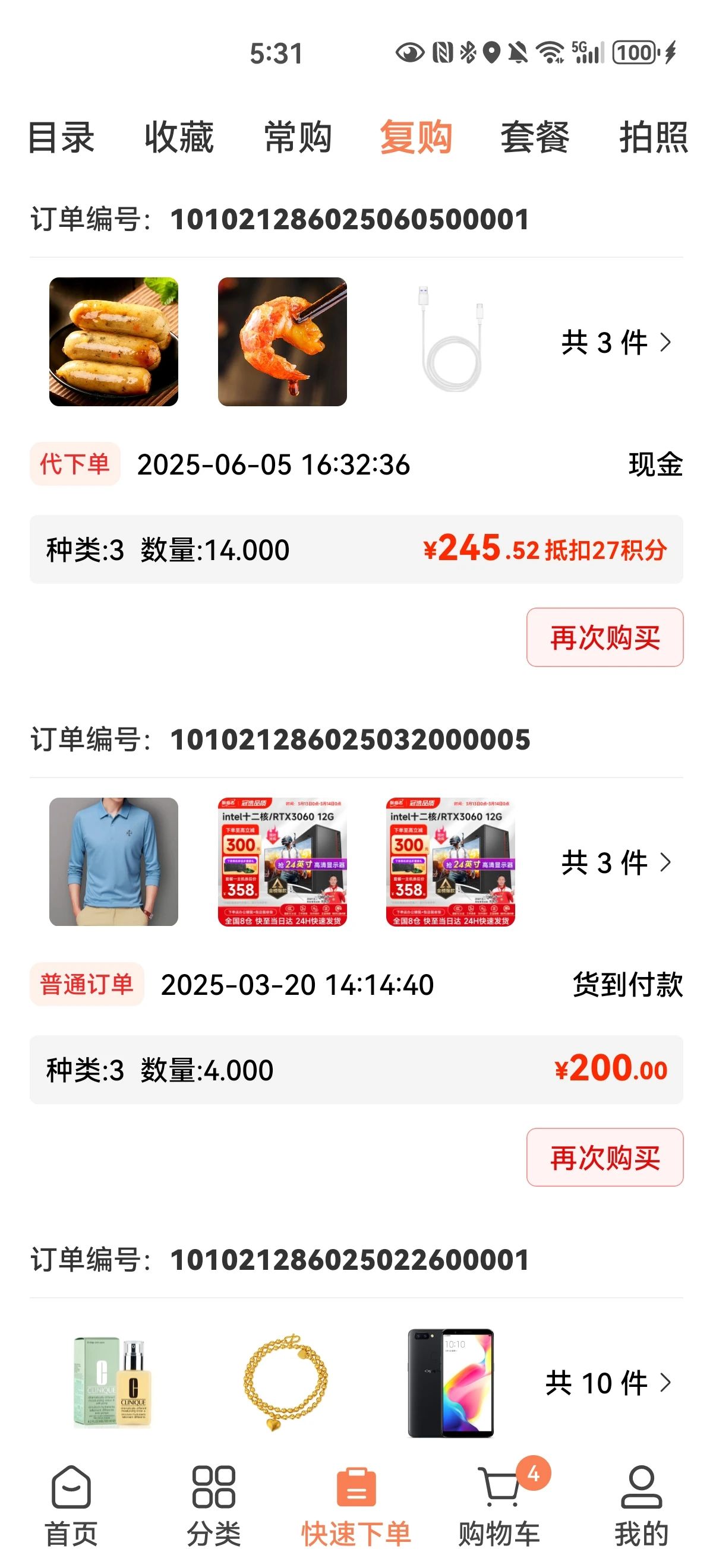 快馬商城客戶一鍵復購和套餐下單界面局部截圖