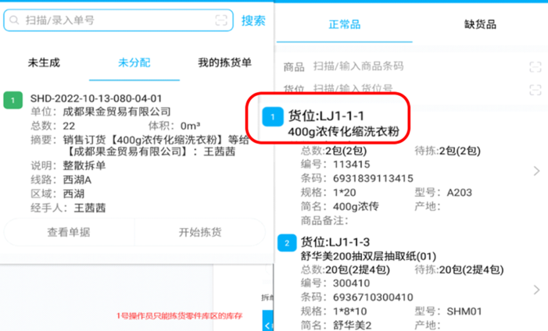 4、拆單后,1號操作員在PDA端看到零件(LJ)庫區的商品去揀貨, 2號操作員只能在PDA端看到整件(ZJ)的商品去揀貨。
