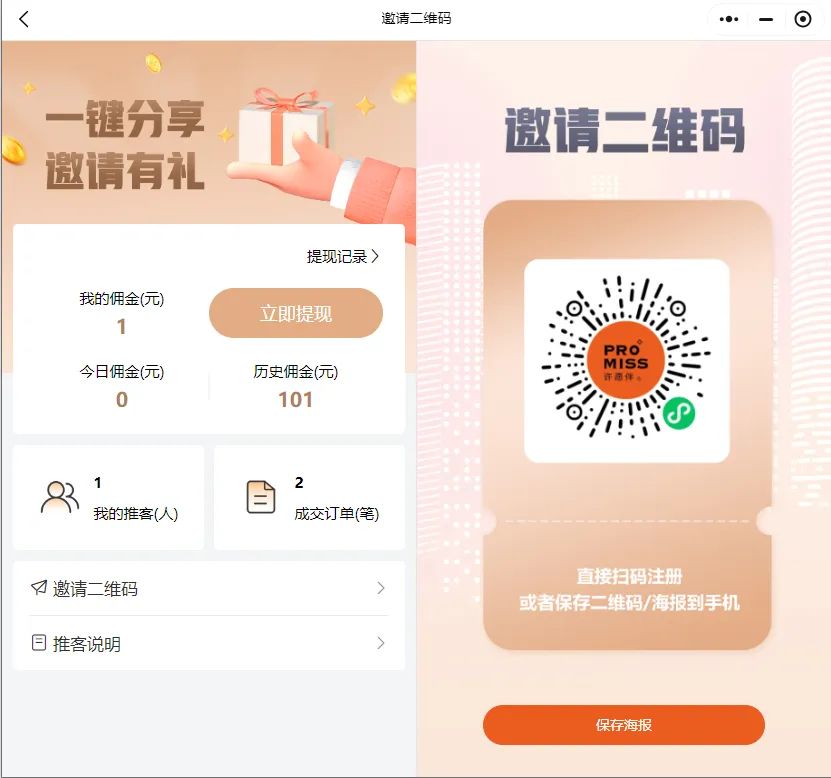客戶可以通過分享專屬邀請碼實現拓客的需求,商城系統自動記錄推客人數,并計算出提成,當完成上下級關系的綁定,在交易后自動進行分潤。