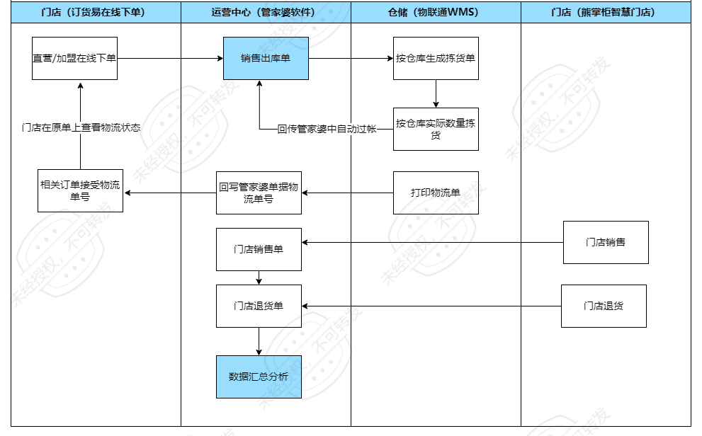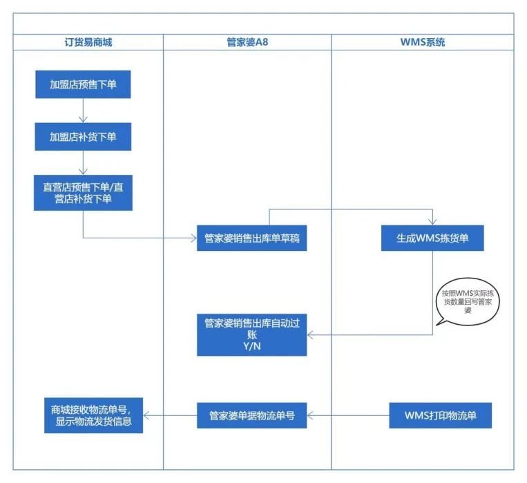 門店可以自主下單,單據匯總到管家婆A8系統中快速審核,通過WMS系統讓倉庫快速揀貨配發至門店,門店日常經營數據快速錄入。