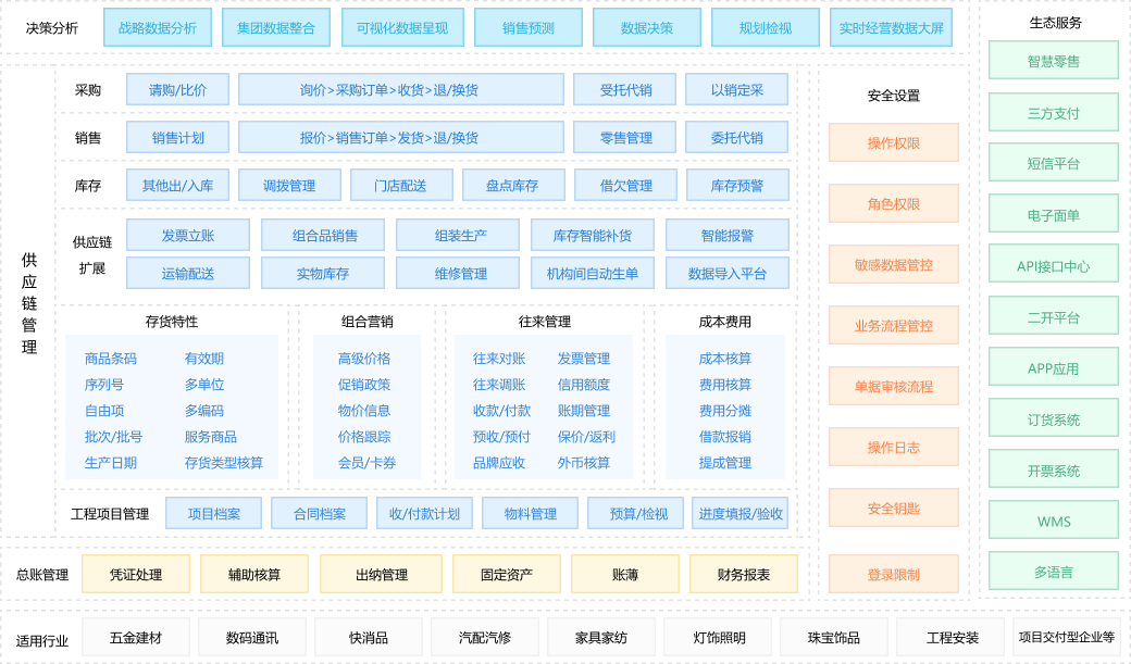 面向中小企業的業務管控模型,構建了開放靈活的數字化平臺,深度集成供應鏈核心業務,無縫協同全流程(采購、生產至銷售、物流及客服),以智能優化驅動企業數字化轉型和新零售布局。